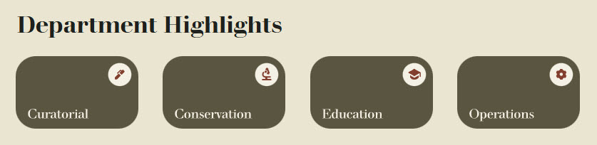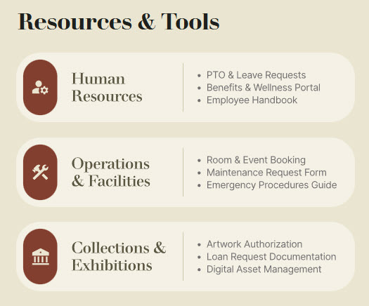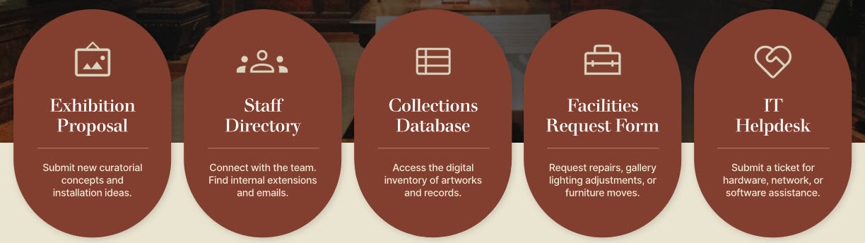- Clear navigation to museum departments, internal resources, and frequently used tools