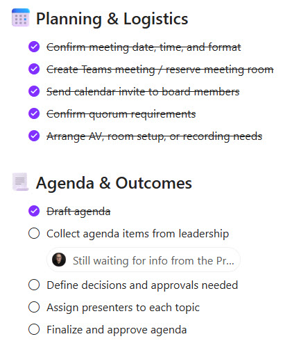 A streamlined, collaborative checklist designed in Microsoft Loop to help leadership teams prepare for board meetings with clarity, accountability, and confidence.