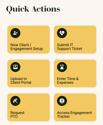 - Includes quick links to frequently used tools, systems, templates, and department pages