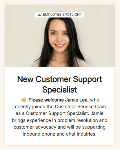 - Employee Spotlight feature to recognize teams and share wins