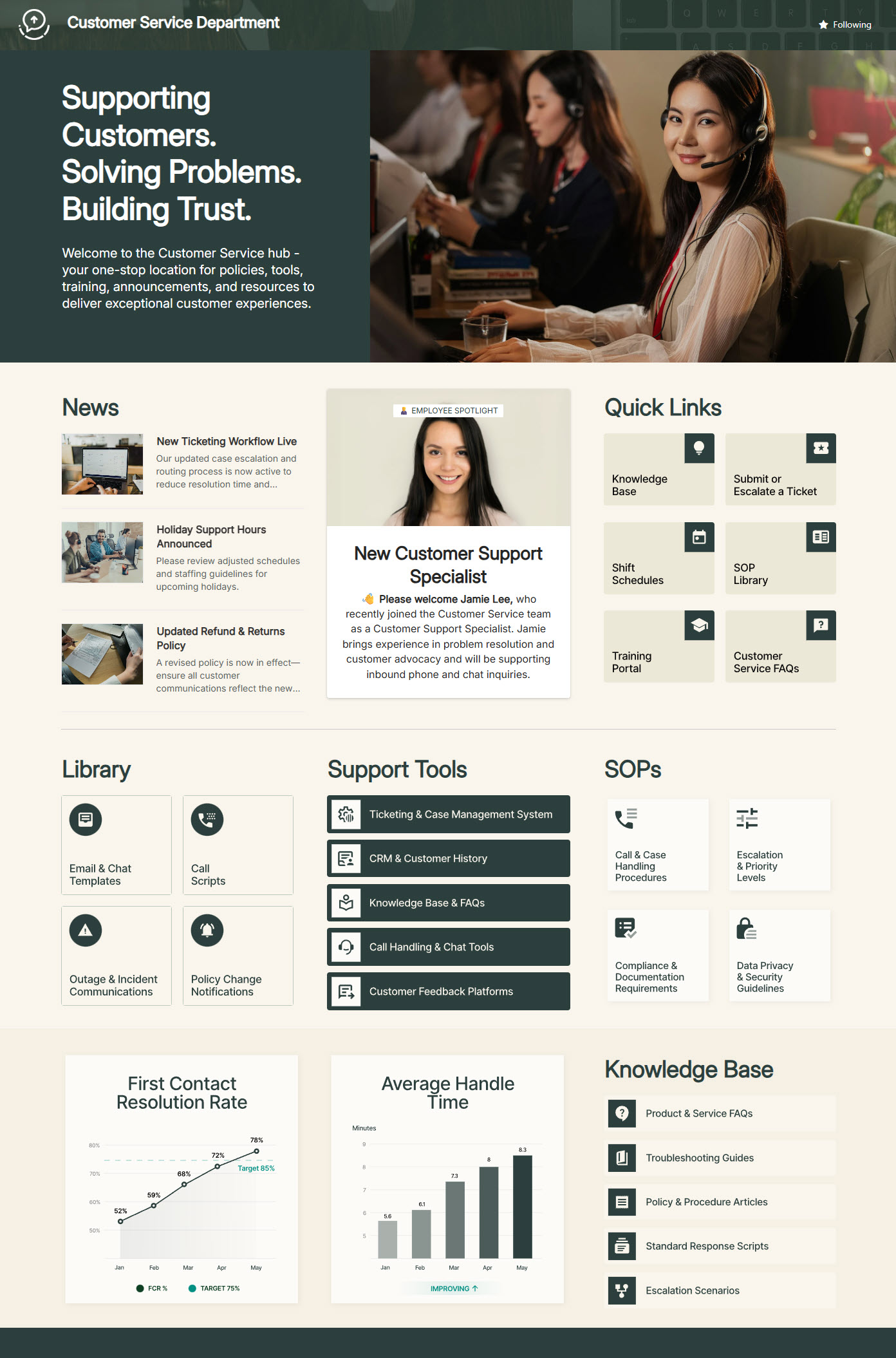 A SharePoint destination for Customer Service Department, bringing tools, updates, SOPs and knowledge together in one easy-to-navigate experience.