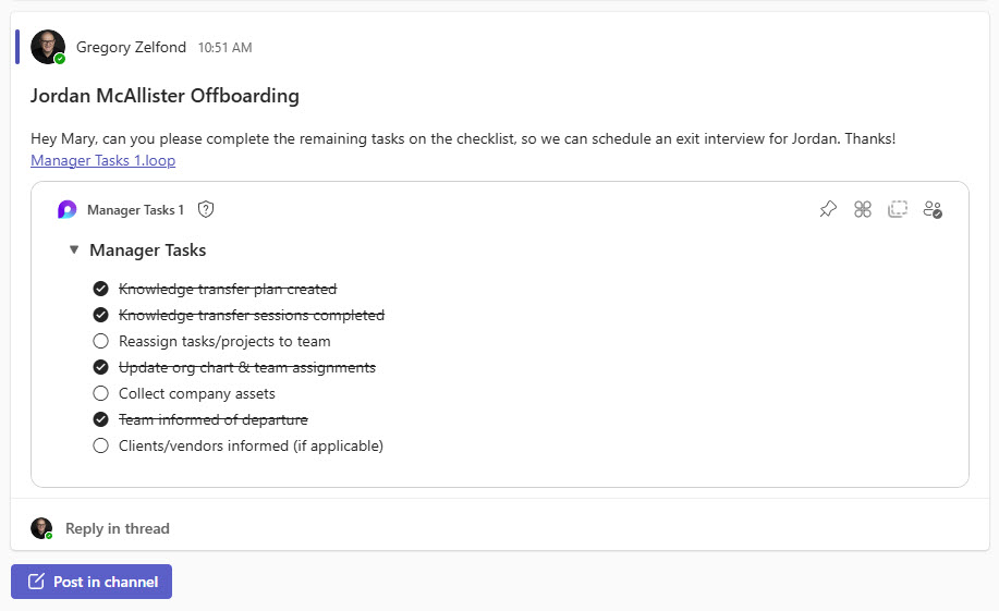 A simple Employee Offboarding Checklist built in Microsoft Loop, featuring collapsible headings that organize all checklist items for HR, IT, and managers to complete in real time.