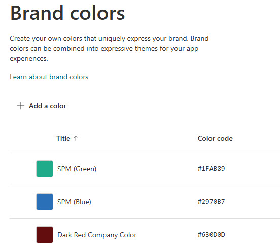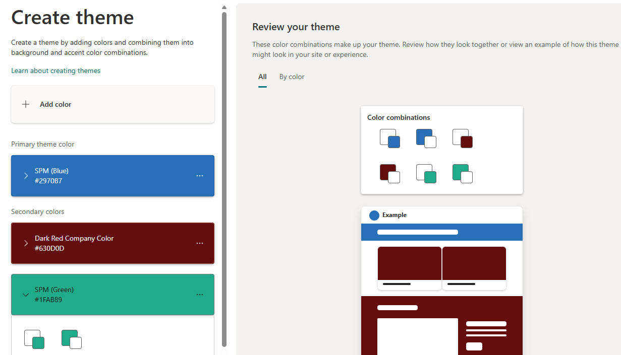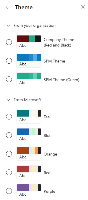 • Custom colors and themes can be created at either the tenant-level Brand Center or the site level