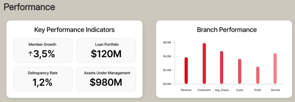 • Performance Dashboards: Track loan portfolios, delinquency rates, and branch KPIs in real time