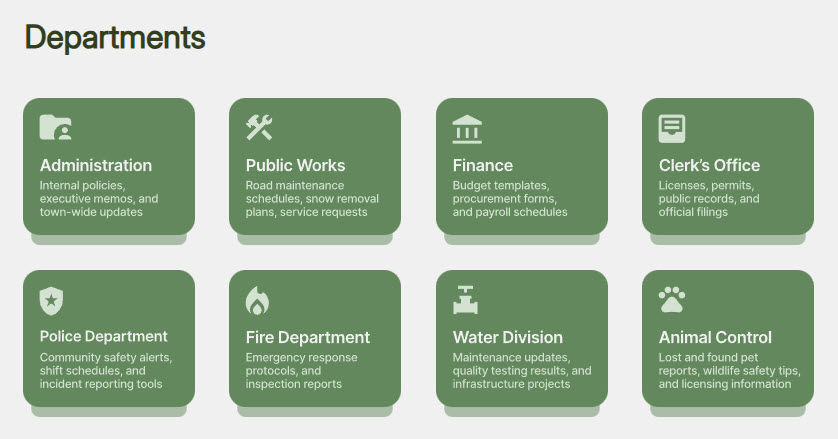 - Department Links section providing one-click access to all major townhall offices (Clerk, Finance, Public Works, Parks & Rec, Police, Fire, etc.)