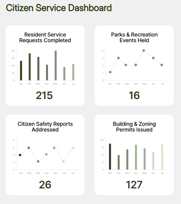 - KPI Dashboard highlighting key municipal metrics such as service requests, budget progress, community programs, and operational health