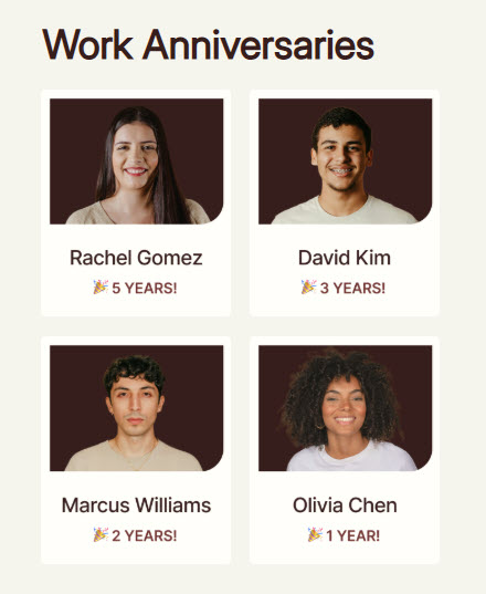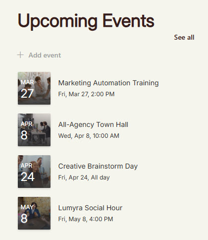 - The upcoming events feed keeps team happenings, deadlines, and office moments visible