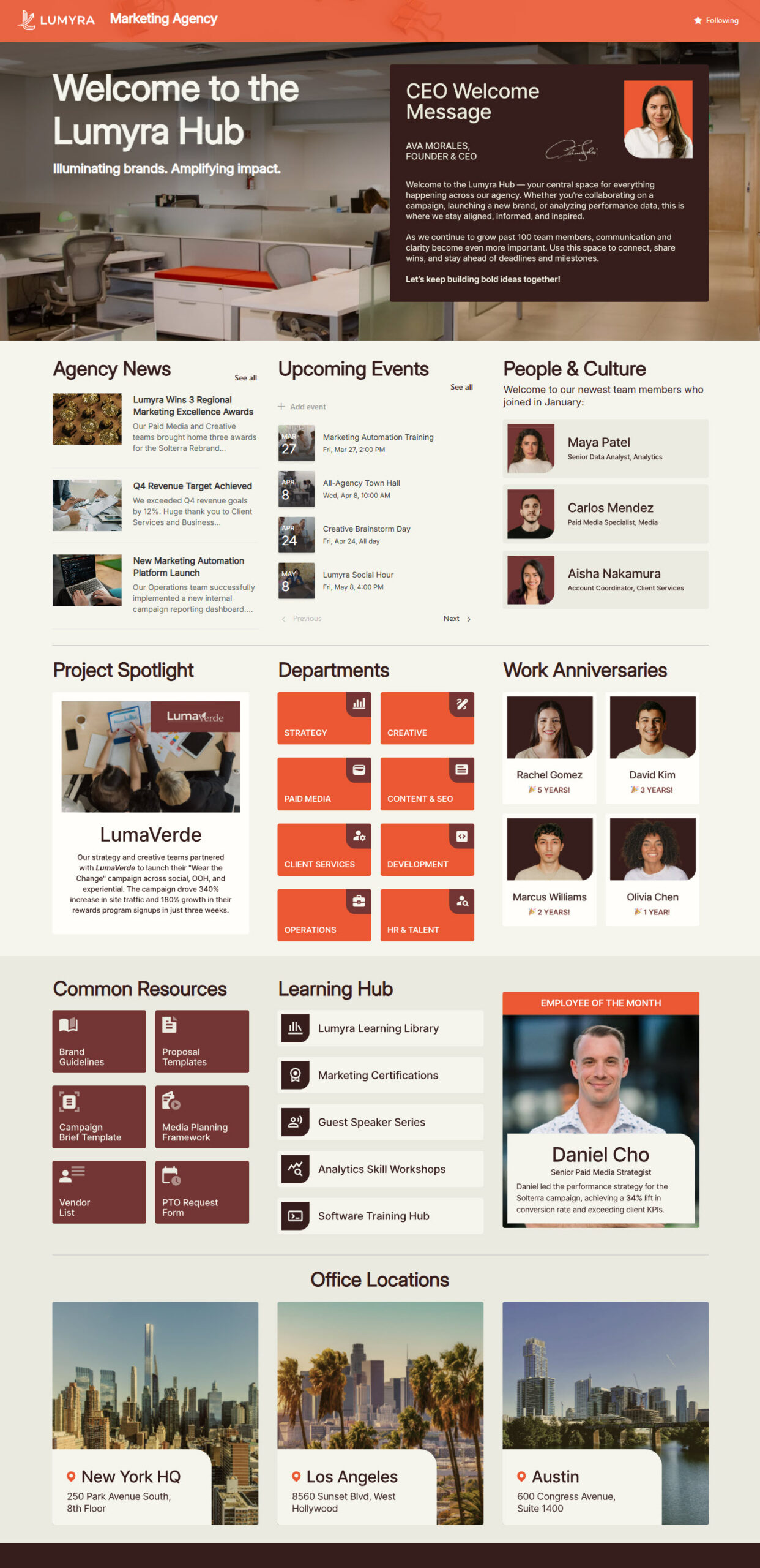 A dynamic intranet homepage that centralizes agency news, culture moments, and day-to-day essentials into one polished, easy-to-scan experience.