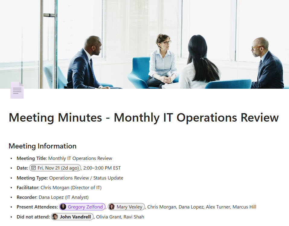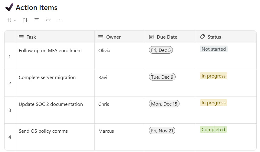 • Action items include owners and due dates, ensuring clear accountability and follow-up