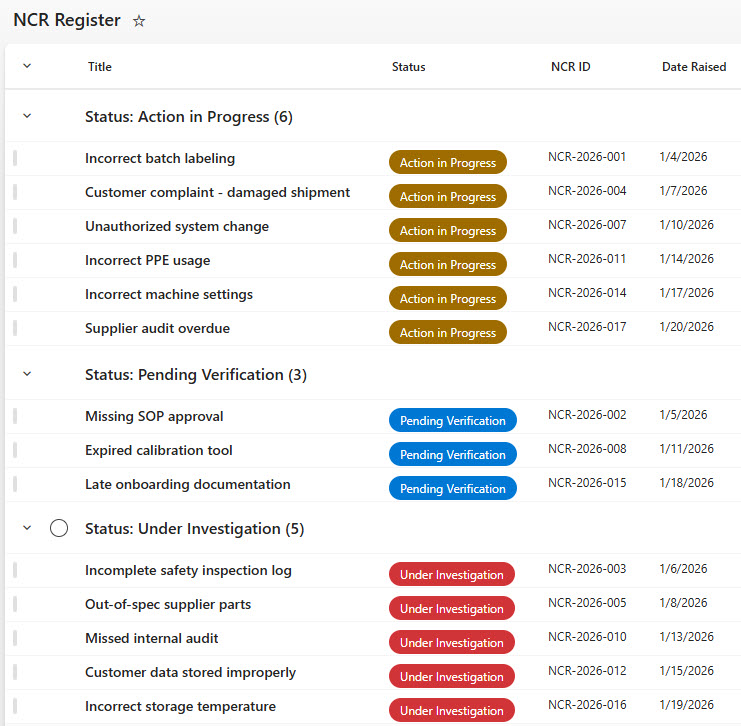 NCR Register Grouped by Status