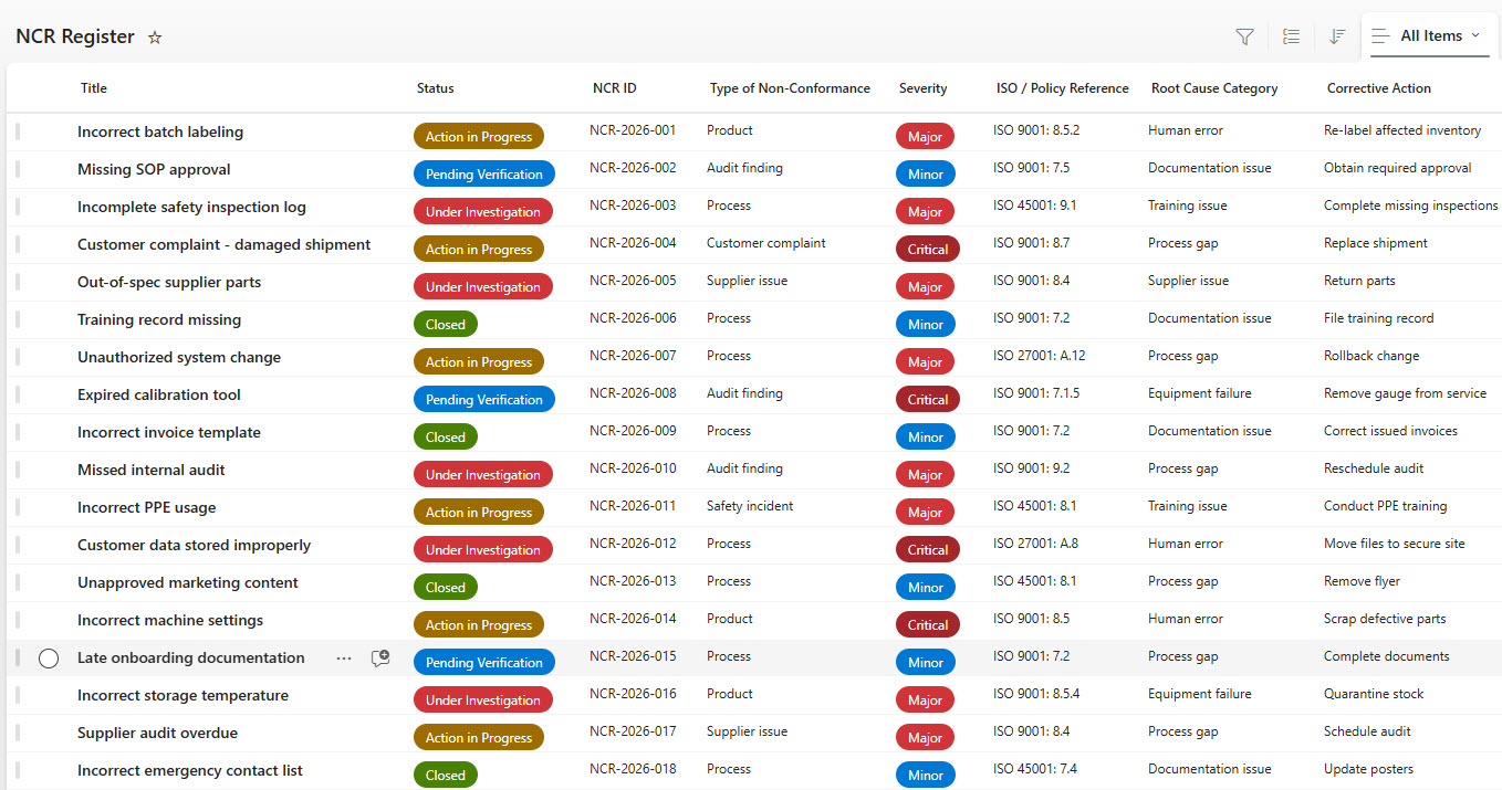 • Centralized NCR register built using Microsoft Lists for easy access and collaboration