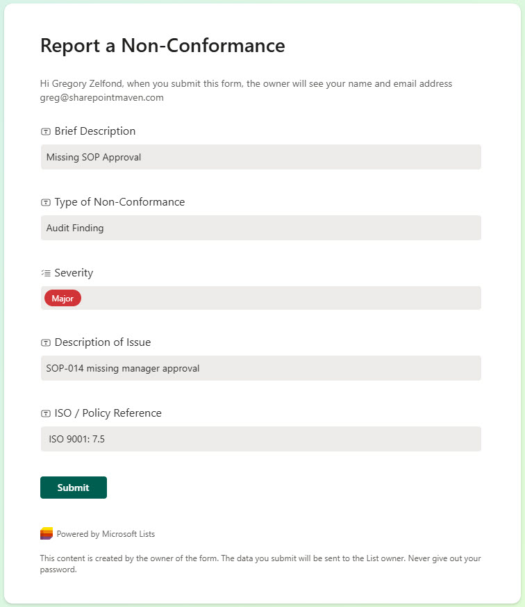 • Integrated Non-Conformance Form for simple issue reporting and submissions