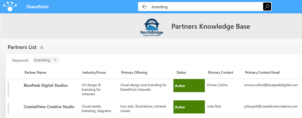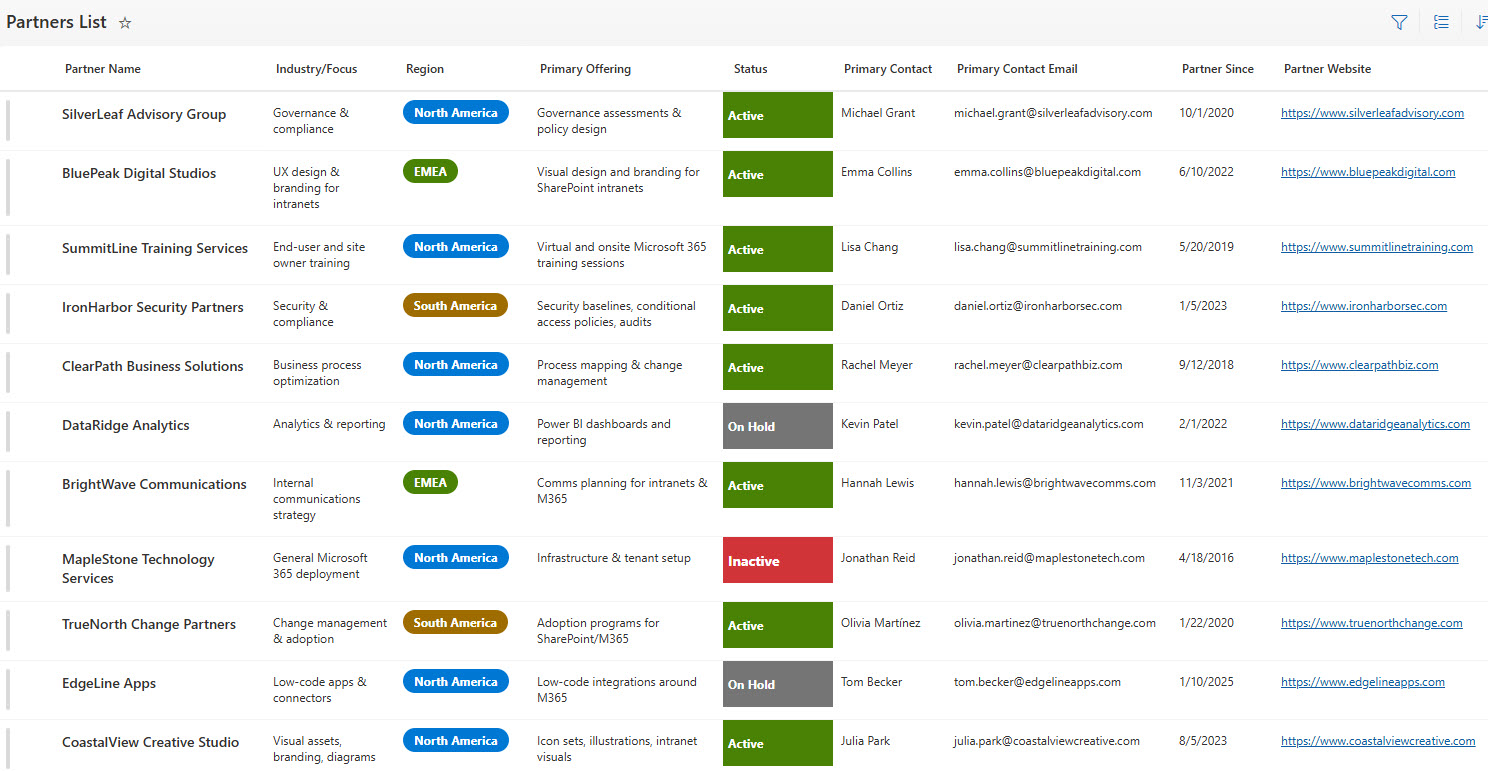 A centralized, searchable Partner Directory built in SharePoint, designed to help employees quickly find approved vendors, consultants, and strategic partners.