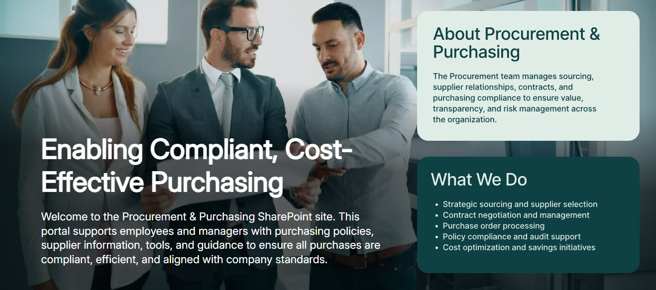 - Employee-facing SharePoint portal designed for Procurement and Purchasing operations