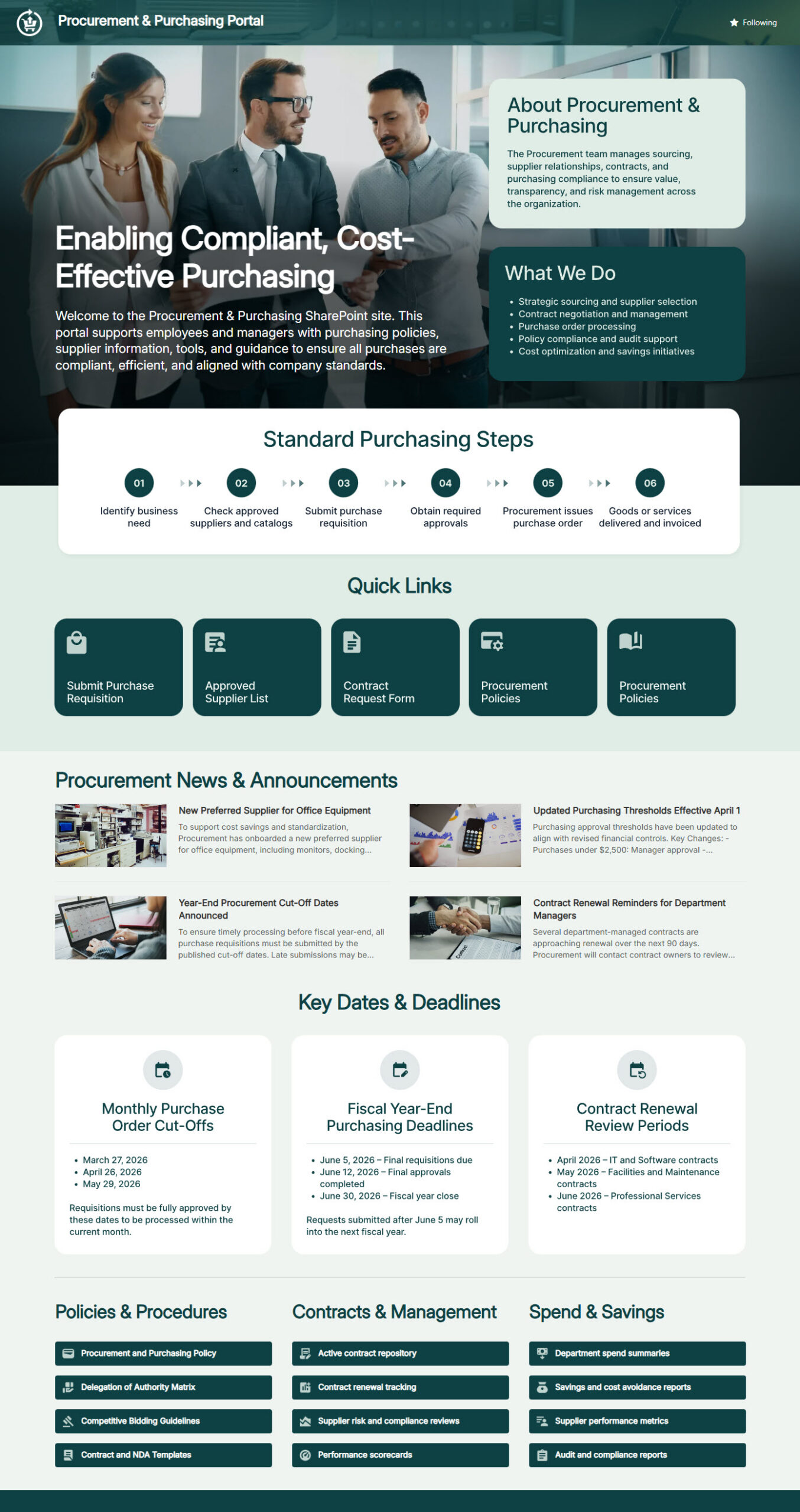 Procurement & Purchasing Employee-Facing SharePoint Portal Centralizing Processes, Policies, and Key Department Resources