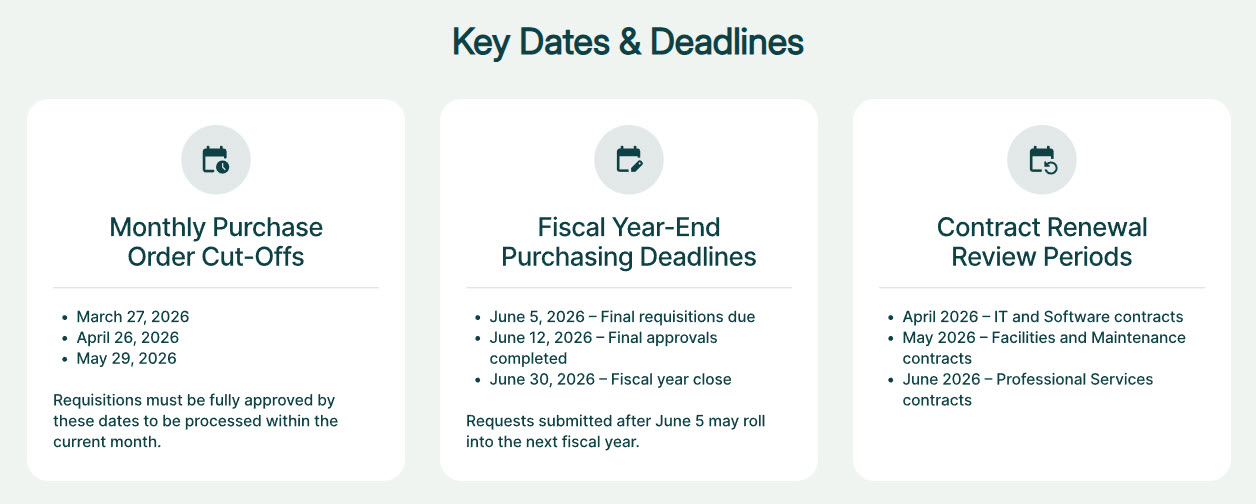 - Key dates section featuring monthly purchase cut-off deadlines and fiscal year milestones