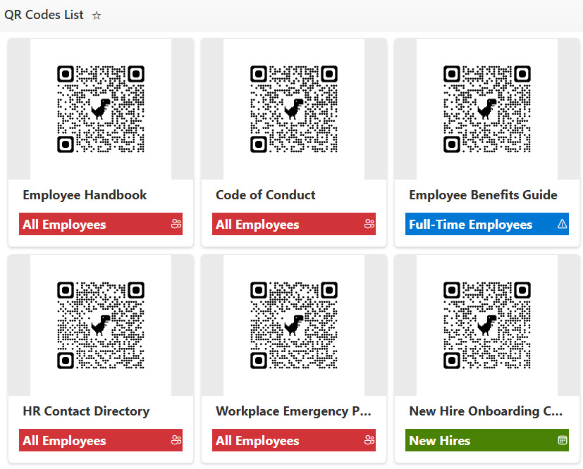 - Centralized Microsoft List for storing QR codes that link to company resources such as the employee handbook, code of conduct, forms, and guides