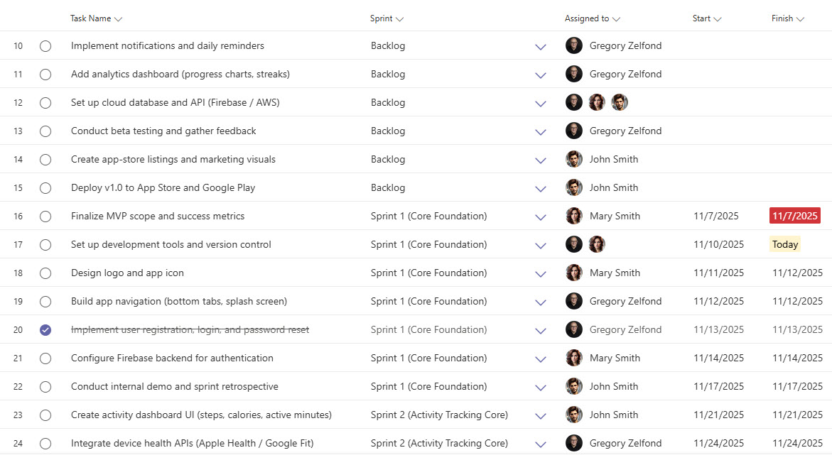 - Create buckets for each sprint (e.g., Sprint 1, Sprint 2, Backlog)