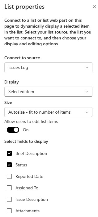 The List Properties web part displays detailed information about a selected list item, often used in conjunction with the List web part.
