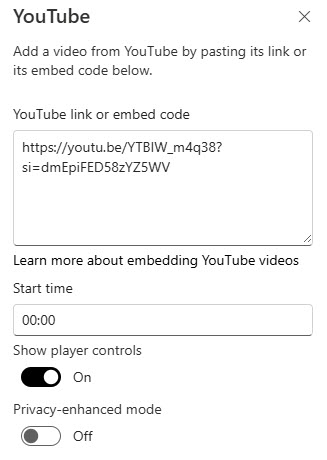 The YouTube web part lets you embed YouTube videos directly onto your SharePoint page using the video URL.